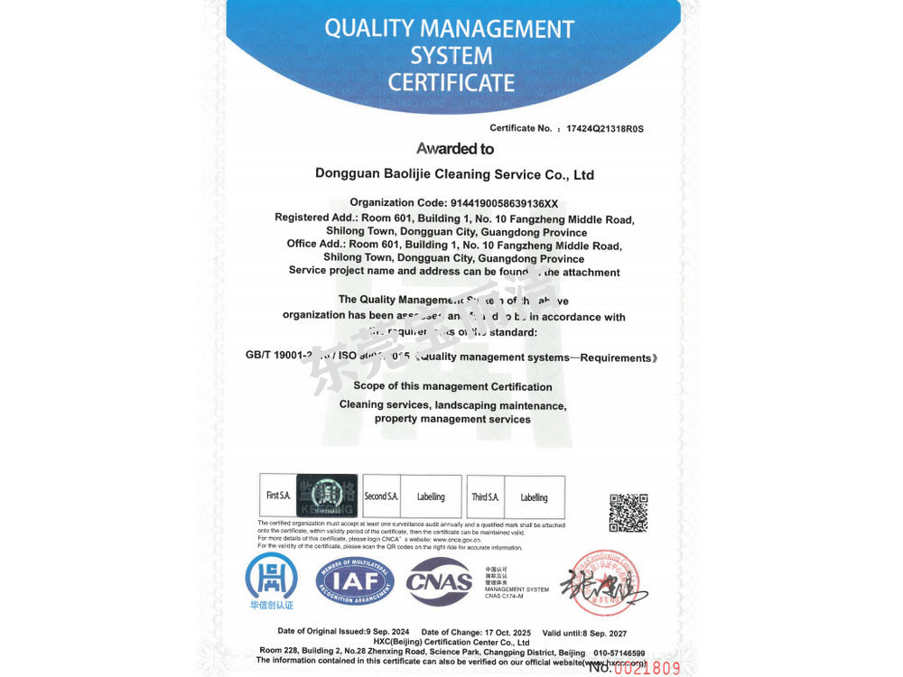 寶麗(lì)潔質量管理體係認(rèn)證書